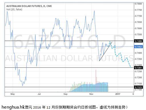 澳元2016年12月份到期期货合约(芝商所合约代码6AZ6)上周五收盘于0.7452。澳元已经在0.7500至0.7350的三角形区域内调整近两个星期。本周预计澳元会突破此三角形区域选择方向。鉴于美联储本周加息几率较大,澳元或大概率向下突破。