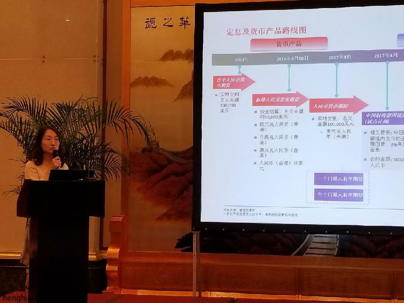 香港是全球主要的离岸人民币交易中心。自2012年起,港交所便陆续推出了一系列人民币汇率产品。本次会议我们也有幸邀请到了香港交易所市场发展科郭菲女士。郭菲女士向大家介绍了港交所人民币衍生品的运行情况,并就其中交易较为活跃的人民币期货和人民币期权合约进行了详细展开,令与会者受益匪浅。