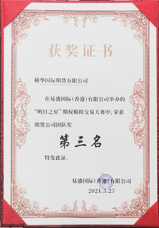 【易盛国际】横华国际荣获易盛香港“明日之星”期权模拟交易大赛期货公司团队奖第三名
